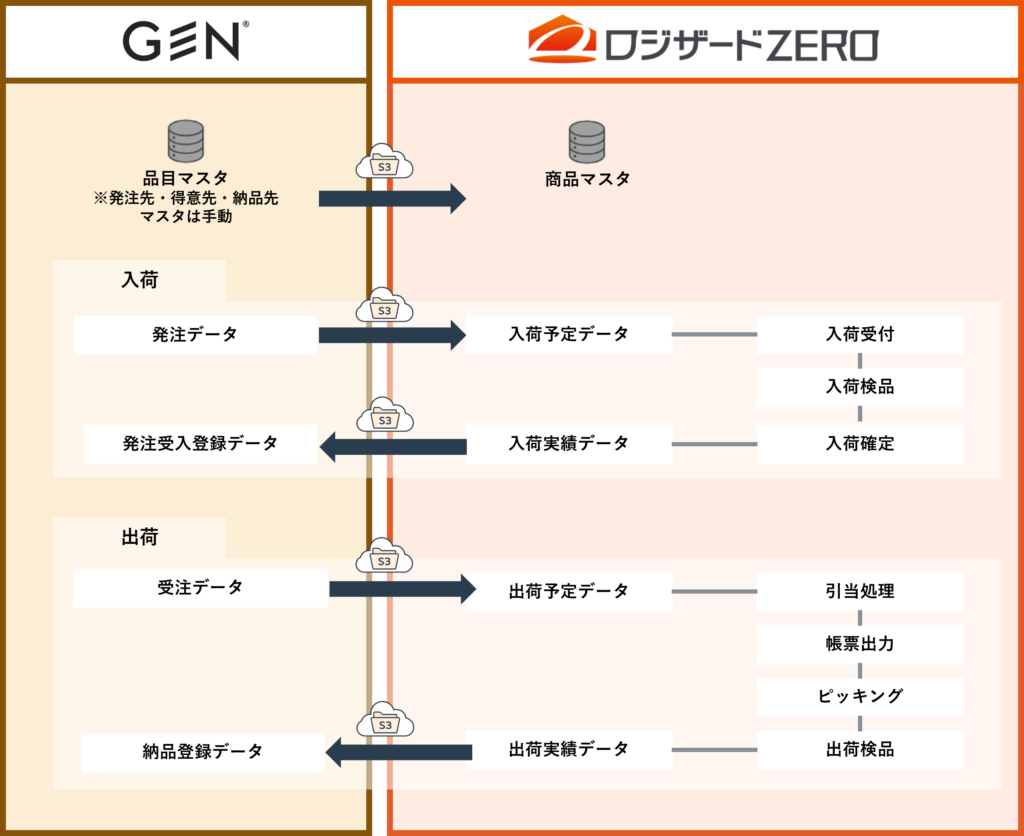 「ロジザードZERO」と「GEN」間で、以下の各種データを自動連携します。
